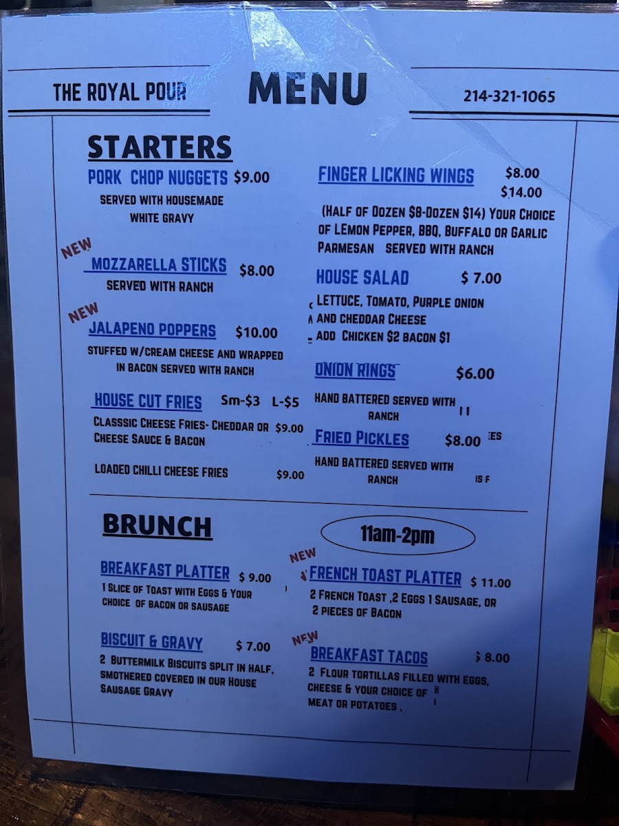 Welcome to The Royal Pour Bar and Grill, a delightful gem nestled at 9909 Garland Rd in Dallas, TX. This inviting neighborhood spot combines a lively atmosphere with a menu that truly impresses. From the moment you step in, you're greeted by friendly bartenders and the promise of a great time.